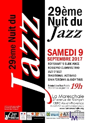 Programmation Jazz de la soirée 19h-20h : Roy Swart’s Slide Voice - quintet Roy Swart's, que l'on ne présente plus, propose cette année un quintet de super jazzmen : Phil Bruzzo au trombone ténor et au vocal, Jean-Luc Ansaldi à la guitare, Dan Raffaelli à la guitare-basse, Roland Garrassin aux drums et Roy Swart's au slide voice, une nouvelle technique musicale, la voix à coulisse, dont il est l'inventeur ! Ils improvisent sur les standards du jazz, dans un style très groove n' bop propice à la danse, avec 2 chanteurs de folie, Phil et Roy, qui scattent sur tout ce qui bouge : ça balance terrible ! Un CD suivra… 20h-20h15, 21h15-21h30, 22h30-22h45, 23h45-0h : Roselynd Clementz Trio - Les intermèdes Roselynd Clementz vocal-auteur compositeur, François Pioger guitare, vocal-arrangements-compositions, Jean Christophe Gautier contrebasse. Un jazz esthétique & créatif tout en émotion. Aux compositions swing & mélodiques flirtant avec les standards auxquels ils s'harmonisent. « Roselynd Clementz, un jazz tout en charme et en glamour, un peu à son image, avec une délicatesse discrète, de celle qui laisse des souvenirs durables. Une artiste rare en touches subtiles et délicates... »JazzMed 20h15-21h15 : Jazz O’ Jazz - quintet Thierry Laloum, saxophone ténor et soprano, Hélène Banoun, saxophone alto, David Timsit, piano, Patrick Ferné, contrebasse, Jean-Marc Amsellem, batterie. Ce projet a été initié par les saxophonistes Thierry Laloum et Hélène Banounet a vu le jour grâce à la présence de David Timsit au piano, actif sur la scène jazz de Marseille depuis son arrivée en 2009, Olivier Pinto, jeune contrebassiste qui poursuit ses études à la classe de Jazz du CNRR de Marseille, ainsi que Jean-Michel Gladieux, batteur dans différentes formations régionales. Le groupe présentera un programme hard-bop (Thelonius Monk, Joe Henderson, Kenny Dorham, Hank Mobley) retravaillé sous la forme d'arrangements originaux. 21h30-22h30 : Traditional Jazz Band - sextet Le Traditional Jazz Band est un orchestre ancré dans le jazz le plus classique, celui de la Nouvelle-Orléans, de Louis Armstrong, Duke Ellington, Fats Waller... Des musiciens d'expérience ayant fréquenté les plus grands festivals européens et même de la Nouvelle Orléans et ayant aussi côtoyé quelques jazzmen historiques. Un répertoire mélodieux mais toujoursswinguant et énergique qui a toujours l'approbation du public car il touche au cœur et aux tripes. 21h30-22h30 : Traditional Jazz Band - sextet Maïa Foreman Chanteuse, Andy Thus Orgue, Guillaume Serre Saxo, Nicolas Nitti batteur, Robert Lanfranka Bassiste. Maïa Foreman & Andy Thus Quintet Soul and Jazz basent l'ensemble de leurs interprétations sur les différents styles de la musique noire américaine. Le quintet revisite Ray Charles, Etta James, Big Joe Turner, Aretha Franklin, James Brown et bien d'autres. Un max de "groove" Rythm & Blues et de Swing ! Maïa Foreman est une superbe et authentique voix venant de la Californie. Andy Thus l'un des rares organistes français spécialiste du Blues et de la Soul, jouant sur son inséparable orgue HAMMOND B-3. Guillaume Serre, saxo, Robert Lanfranka, basse, et Nicolas Nitti batteur, sont les trois complices précieux habitués au style très "black-américain" exigé pour exprimer tous les secrets de la Soul Music. La Mareschale Maison de Quartier Culturelle et Artistique |