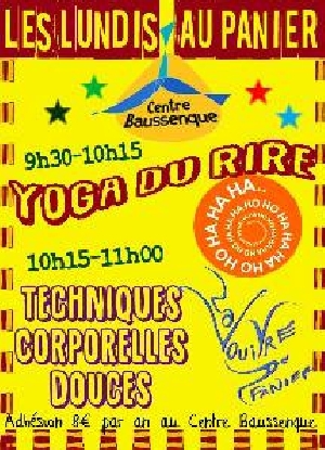 Yoga du rire + gym douce Centre Social Baussenque34 rue Baussenque13302 Marseille Tous les lundis de 9h30 à 11h ![]() Les cours sont gratuits mais il y a une cotisation au Centre Baussenque de 8€ pour l'année si vous assistez à plusieurs cours. Mini séance de Yoga du rire de 45 minutes animée par Eric, Mounira et Ulliah suivie par le cours d'Ulliah qui présente différentes techniques corporelles douces pour débutants: do-in; qi gong; gym douce; relaxation guidée. Le mélange des techniques évolue en fonction du moment. Tél : 06.89.19.38.29 |