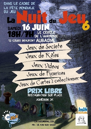 Le Cercle de L'Harmonie 12 Cours Beaumond, à Aubagne (13400). Entré gratuite 3€ d'adhésion pour consommer (question de réglementation et d'assurance). Restauration sur place et conso à cool price toute la nuit. Du samedi 16 juin à 18h à 7h du mat ![]() Jouez toute la nuit à tous les jeux, en famille, seul, en couple ou avec tous vos potes. Pleins de jeux différents seront proposés, il y en aura pour tous les goûts et tous les genres, que vous soyez un Casual Gamer ou un Hardcore Gamer. Du Jeux de Rôle au Jeux de Société, en passant par du Jeux de Plateaux, du Jeux de Cartes, du Jeux Coopératif, des Jeux Grandeur Nature et du Jeux Vidéo. Accueil dans des locaux de plus de 500m², vous aurez donc toute la place nécessaire pour vous exprimer toute la nuit!!! |