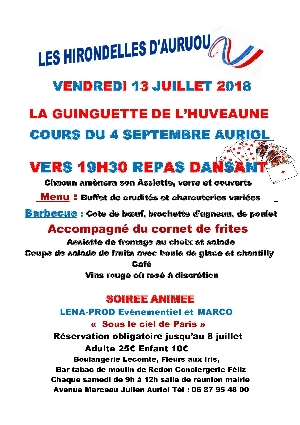 ![]() Prix : 25€/adulte et 10€/enfant Concours de boules et de cartes – 19h30 : Repas dansant animé par Lena-Prod Évènementiel et Marco « Sous le ciel de Paris ». Réservation obligatoire jusqu’au 8 juillet à la Boulangerie Lecomte, Fleurs aux Iris, Conciergerie Feliz et bar tabac (Moulin de Redon). Renseignements : Les Hirondelles d’Auruou : 06 87 95 48